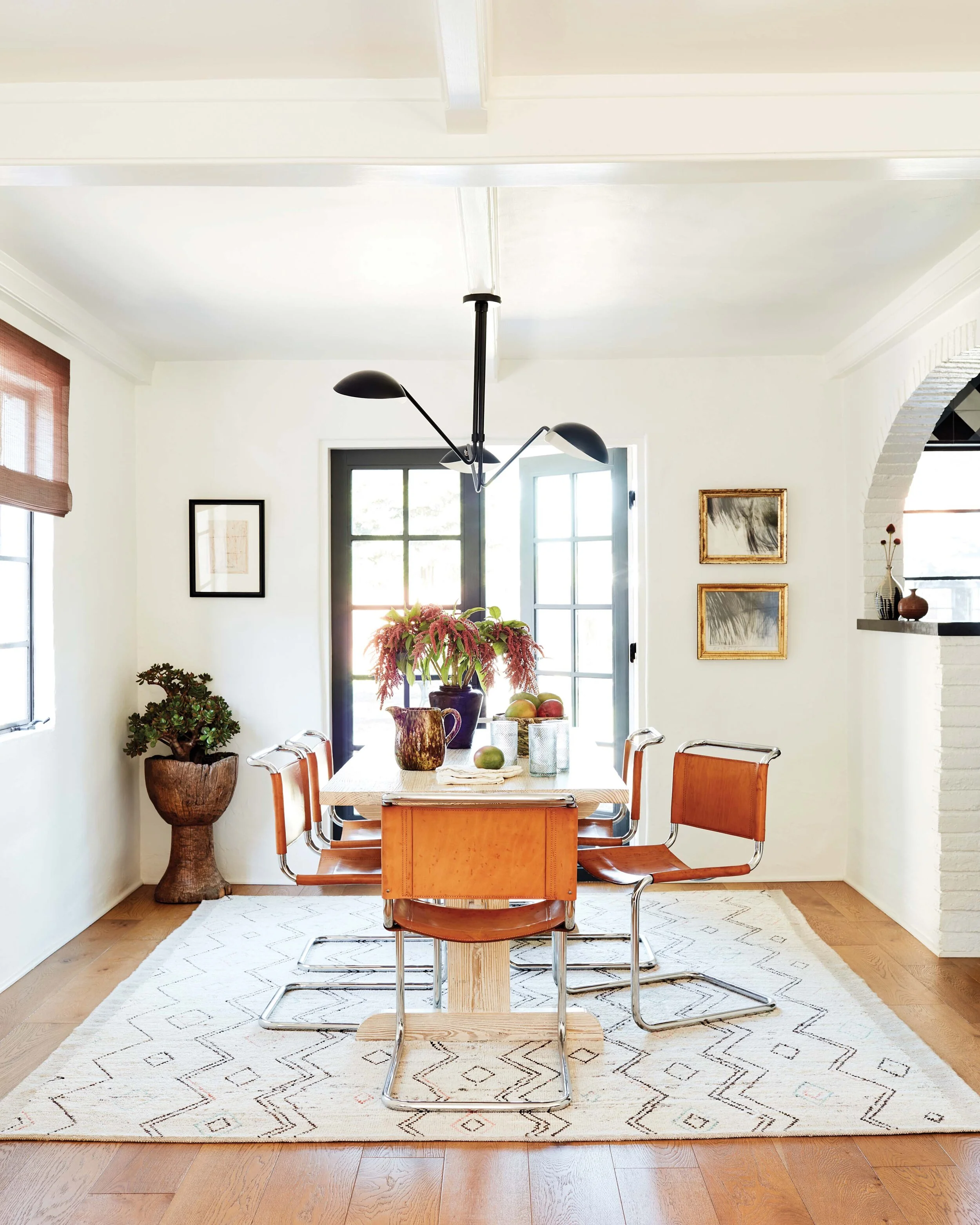 In the dining room, vintage leather chairs sit atop a rug from Jamal’s Rug Collection in L.A.